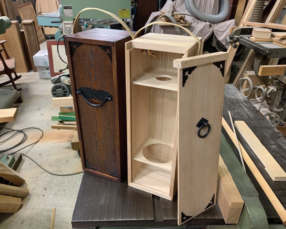 日本の木材の中で一番軽く、丈夫で、保温性、断熱性に優れ、古くから桐箪笥の材料として使われてきた国産の桐の木を贅沢に使った酒瓶専用の収納箱です。ワインボトルや日本酒の4合瓶を収納できます。ふたには、国指定の伝統的工芸品「越前箪笥」の金具をあしらいました。